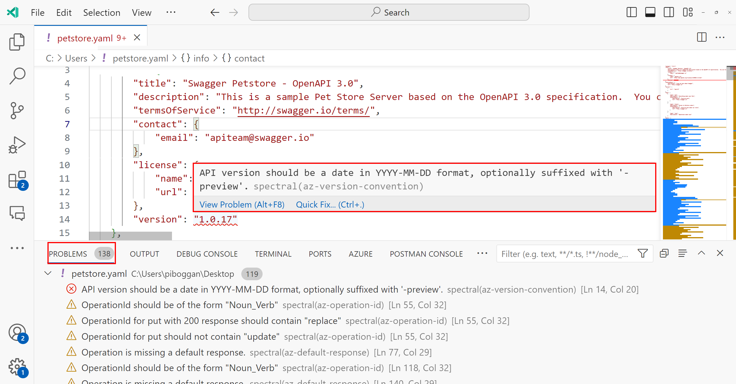 Una vez establecida una guía de estilo de API activa, abrir cualquier archivo de especificación basado en OpenAPI o AsyncAPI desencadena una operación de linting local en Visual Studio Code. Los resultados se muestran en línea en el editor y en la ventana Problemas (Ver>Problemas o Ctrl+Mayús+M).
