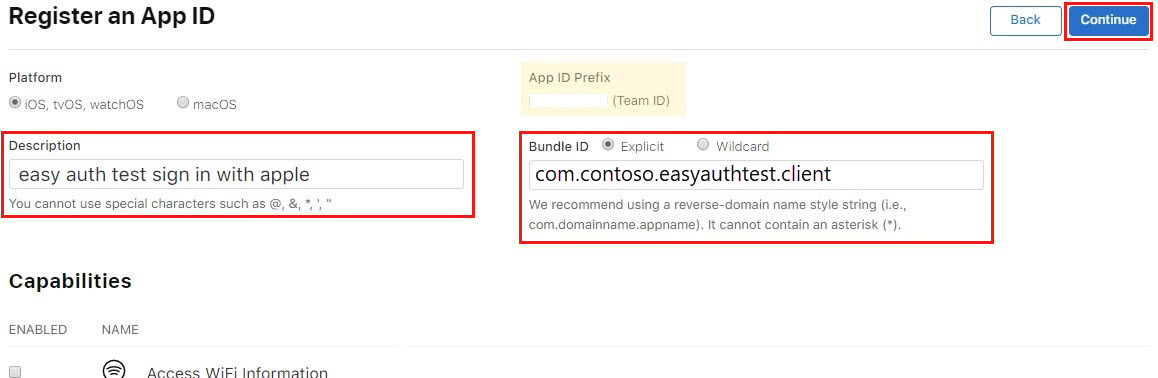 En la lista de funcionalidades, seleccione Iniciar sesión con Apple y, a continuación, seleccione Continuar. Anote el prefijo de id. de aplicación (id. de equipo) de este paso. Lo necesitará más adelante.