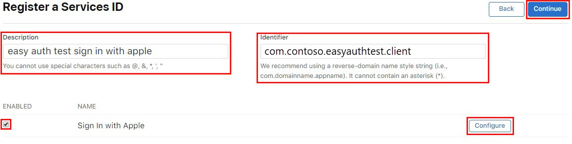 La descripción es lo que ve el usuario en la pantalla de consentimiento. El identificador es el ID de cliente que se utiliza para configurar el proveedor de Apple con tu servicio de aplicaciones.