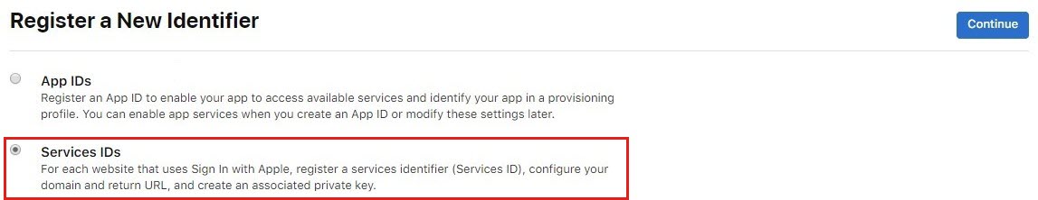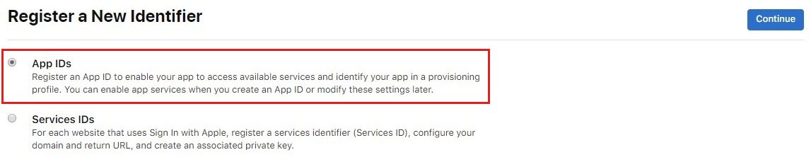 En la página Register a New Identifier (Registrar un nuevo identificador), elija App IDs (Identificadores de aplicación) y seleccione Continue (Continuar). Los identificadores de aplicación incluyen uno o varios identificadores de servicio.