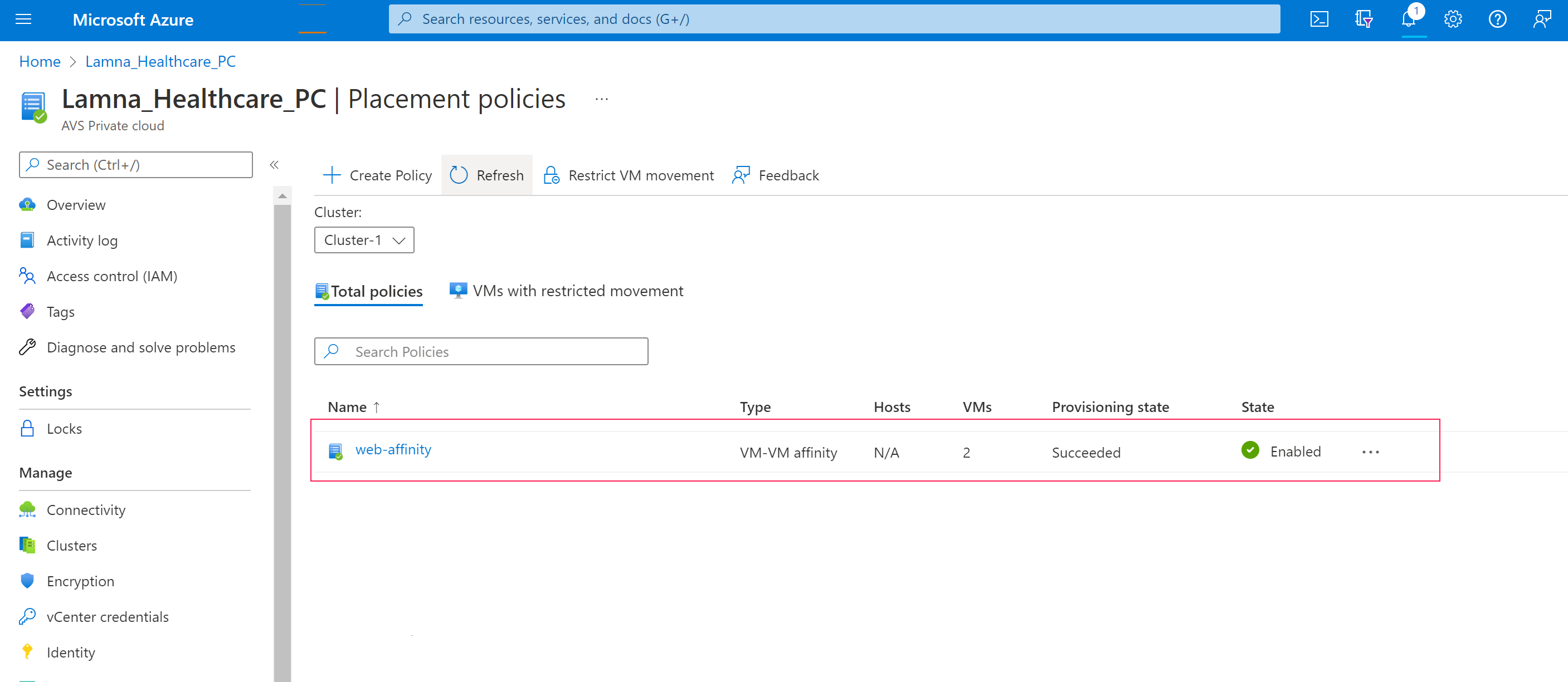 - Vaya a Manage Placement policies (Administrar directivas de selección de ubicación) y seleccione Restrict VM movement (Restringir movimiento de máquinas virtuales).