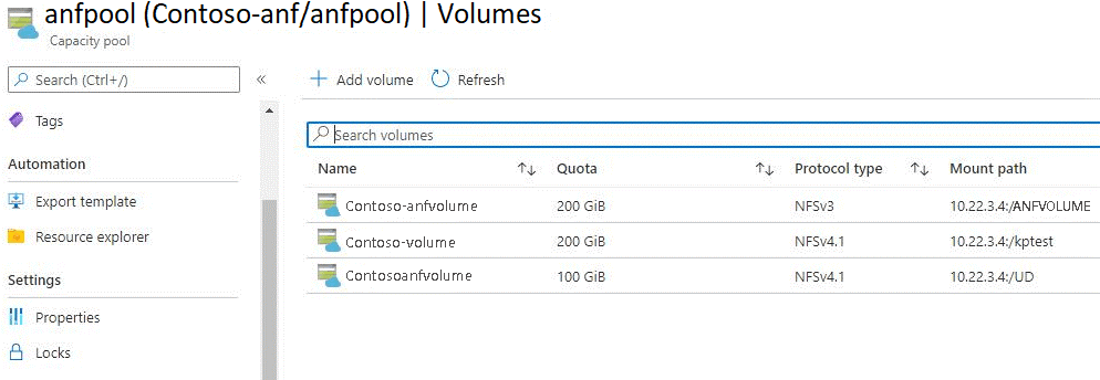 Recurso compartido NFS: Azure NetApp Files colabora en la creación de volúmenes con NFS o un protocolo dual (NFS y SMB). El consumo de la capacidad de un volumen se descuenta de la capacidad aprovisionada de su grupo. NFS se puede montar en el servidor Linux mediante las líneas de comandos o las entradas /etc/fstab.