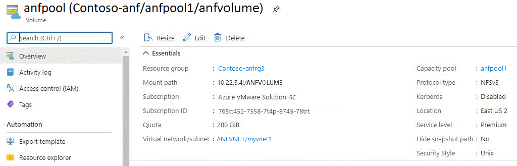 Puede notar que el volumen anfvolume tiene un tamaño de 200 GiB y se encuentra en el grupo de capacidad anfpool1. Se exporta como un recurso compartido de archivos NFS a través de 10.22.3.4:/ANFVOLUME. Se ha creado una dirección IP privada de la red virtual de Azure para Azure NetApp Files y la ruta de acceso NFS para montarla en la máquina virtual.