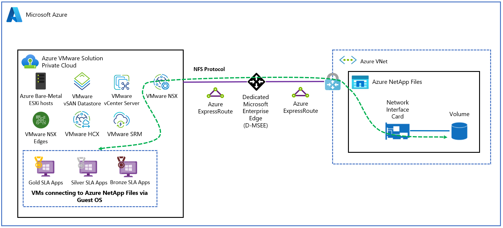 En el diagrama se muestra una conexión a través de Azure ExpressRoute a una nube privada de Azure VMware Solution. El entorno de Azure VMware Solution accede al recurso compartido de Azure NetApp Files montado en las VM de Azure VMware Solution.
