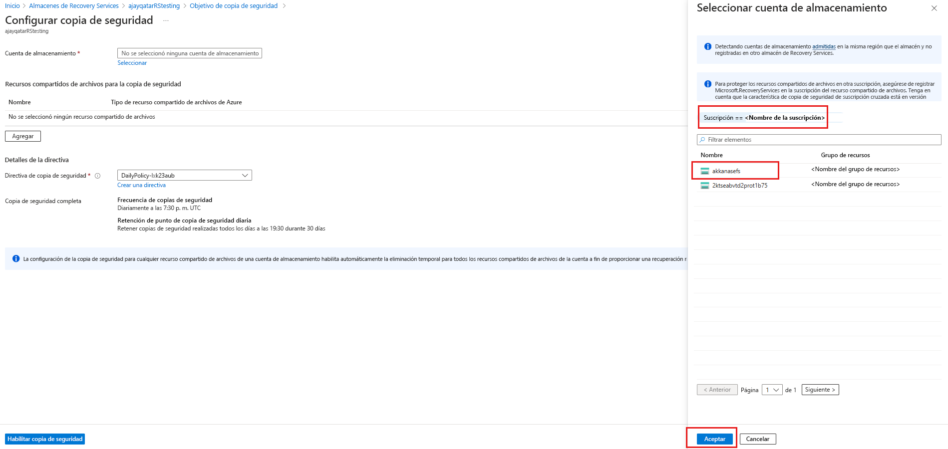 Si desea configurar la operación de copia de seguridad con una cuenta de almacenamiento en otra suscripción (Copia de seguridad entre suscripciones), elija la otra suscripción en el filtro Suscripción . Aparecen las cuentas de almacenamiento de la suscripción seleccionada.