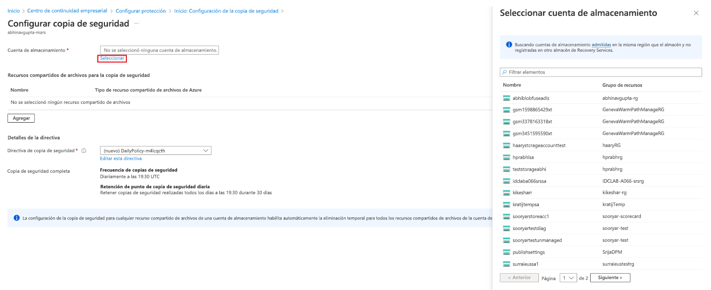 En el panel Configurar copia de seguridad, haga clic en Seleccionar para seleccionar la cuenta de almacenamiento que contiene los recursos compartidos de archivos de los que se va a realizar una copia de seguridad.