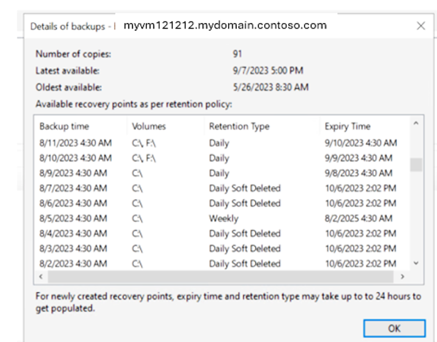 - En Puntos de recuperación disponibles, seleccione Ver detalles para enumerar todos los puntos de recuperación disponibles.