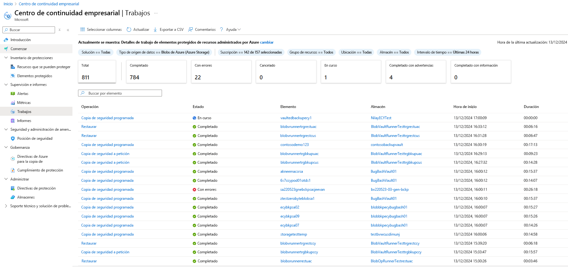 Seguimiento de la restauración: use la vista Trabajos de copia de seguridad para hacer un seguimiento de los detalles y el estado de las restauraciones. Para ello, vaya a Resiliencia>Trabajos. El estado mostrará En curso mientras se realiza la restauración.