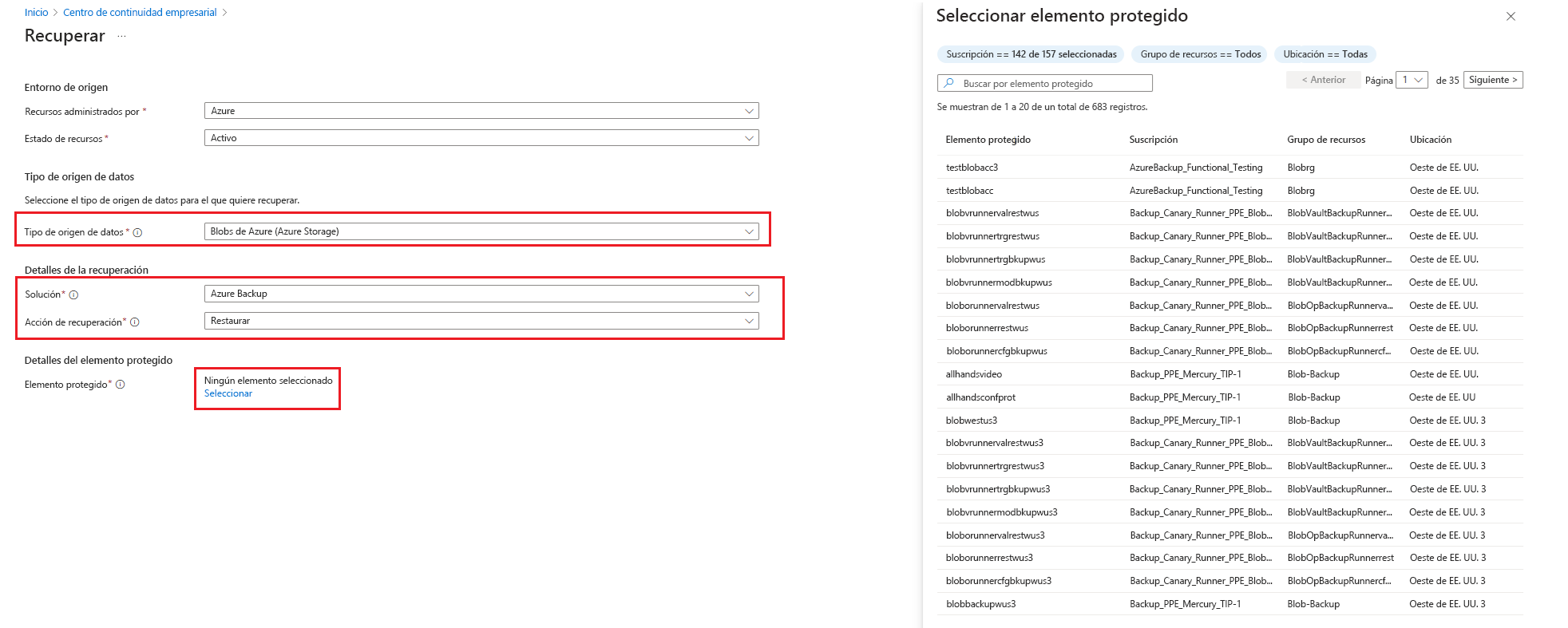 - Los blobs se restaurarán en la misma cuenta de almacenamiento. Por consiguiente, se sobrescribirán los blobs que hayan sufrido cambios desde el momento que se está restaurando.
