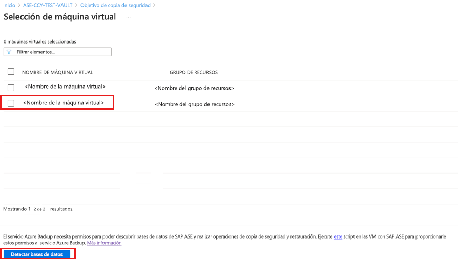 Azure Backup detecta todas las bases de datos de SAP ASE en la máquina virtual. Durante la detección, Azure Backup registra la máquina virtual con el almacén e instala una extensión en la máquina virtual. No se instala ningún agente en la base de datos.
