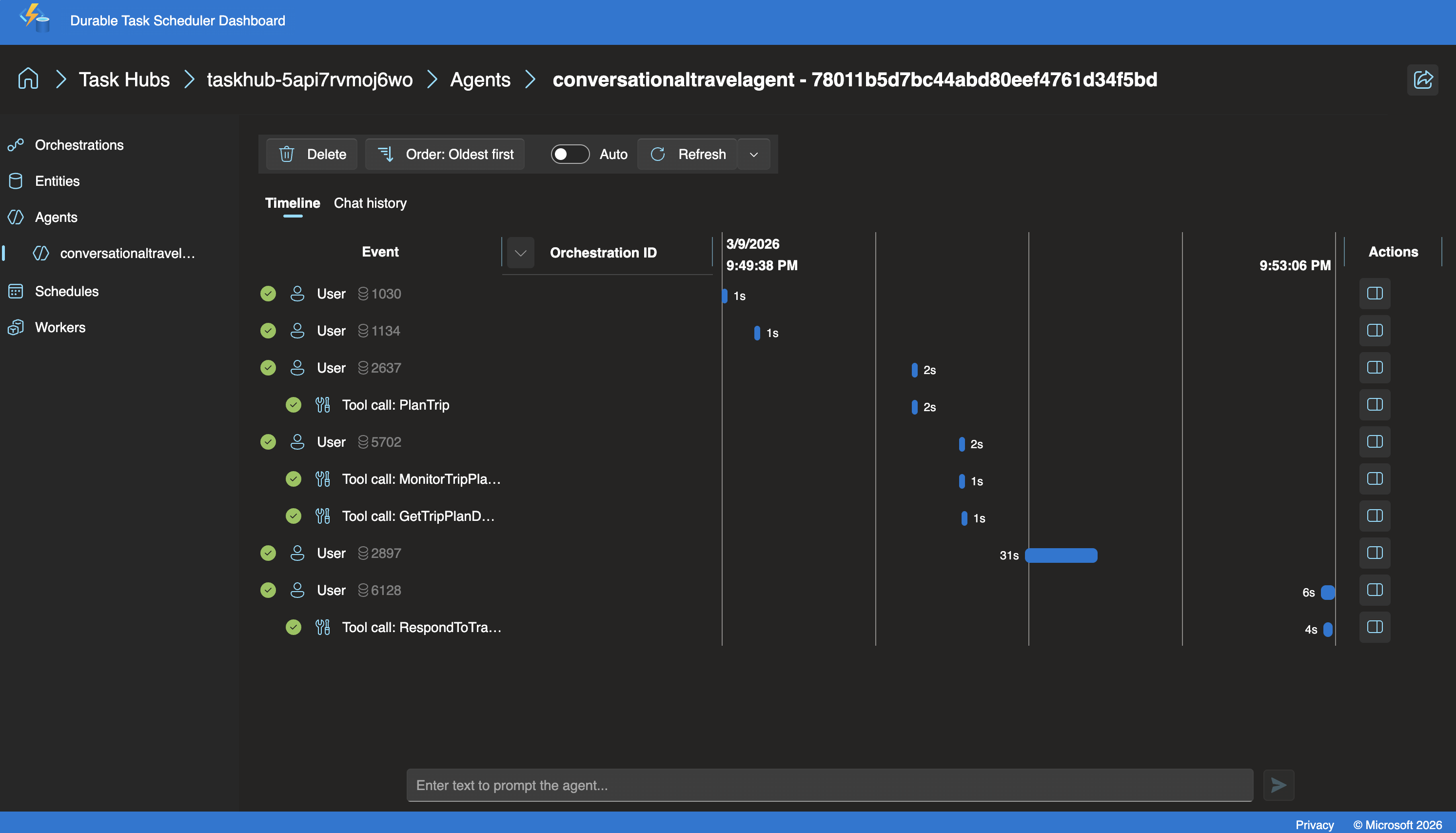Use el panel de Durable Task Scheduler para obtener visibilidad completa de sus agentes duraderos, orquestaciones y flujos de trabajo basados en grafos:
