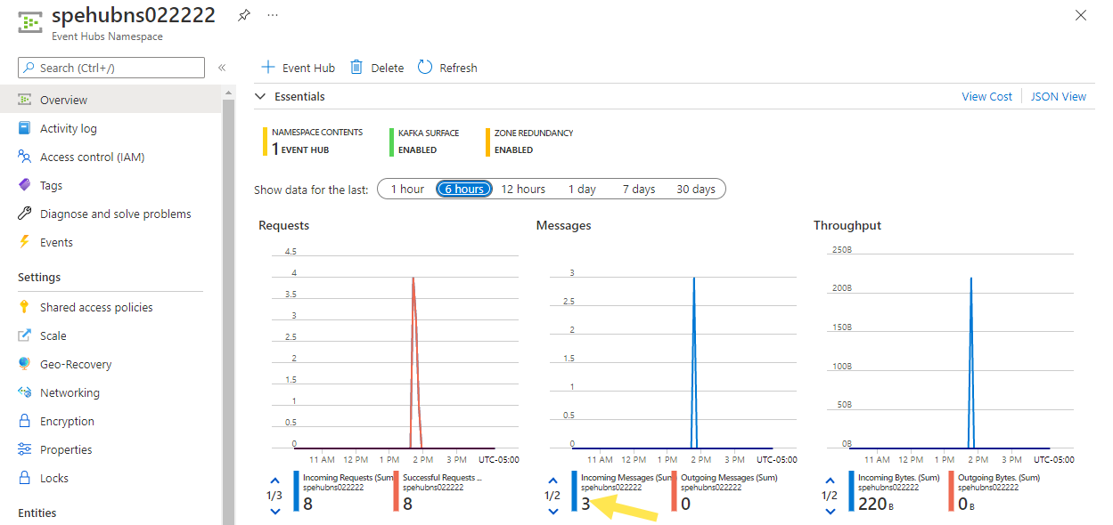 az login.En Azure Portal, compruebe que el centro de eventos recibió los mensajes. Para actualizar el gráfico, actualice la página. Puede tardar unos segundos en mostrar que se reciben los mensajes.