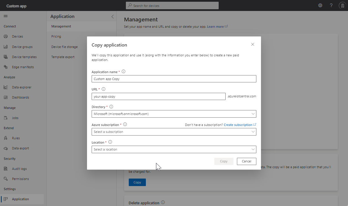 Puede crear una copia de cualquier aplicación, menos las instancias de dispositivo, el historial de datos del dispositivo y los datos de usuario. La copia usa un plan de tarifa estándar que se le facturará: