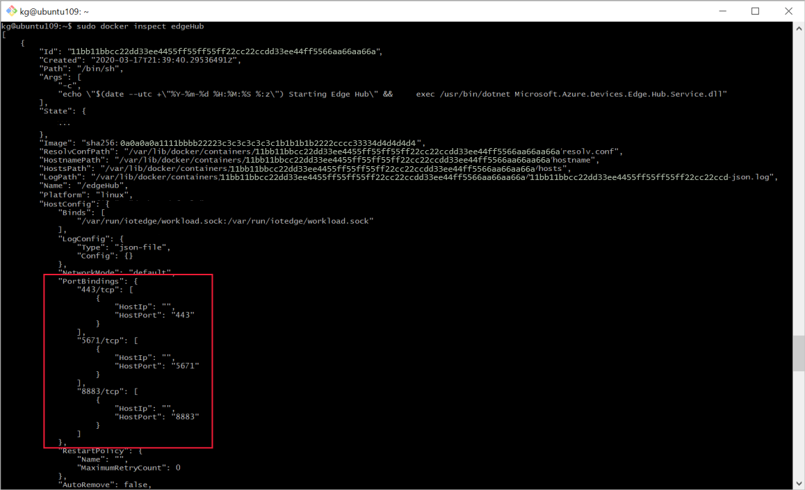 En este ejemplo de edgeHub se usa el HostConfig.PortBindings parámetro para asignar puertos expuestos en el contenedor a un puerto del dispositivo host.