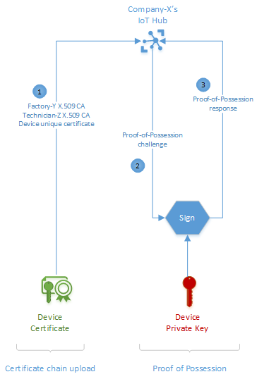 Los dispositivos que se fabrican con el uso del proceso de autenticación mediante certificados CA X.509 en mente se equipan con certificados exclusivos para cada dispositivo, así como con una cadena de certificados que procede de la cadena de suministro de fabricación que corresponde. La conexión del dispositivo, incluso cuando se establece por primera vez, consiste en un proceso de dos pasos: la carga de la cadena de certificados y la prueba de posesión.