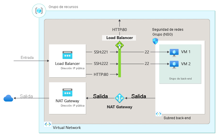 Las reglas NAT de entrada le permiten conectarse a máquinas virtuales (VM) de una red virtual de Azure con una dirección IP pública y un número de puerto de Azure Load Balancer.