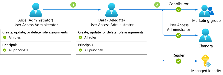 En el diagrama siguiente se muestra cómo Alice puede delegar las responsabilidades de asignación de roles a Dara. Para conocer los pasos específicos, consulte Asignar un usuario como administrador de una suscripción de Azure.