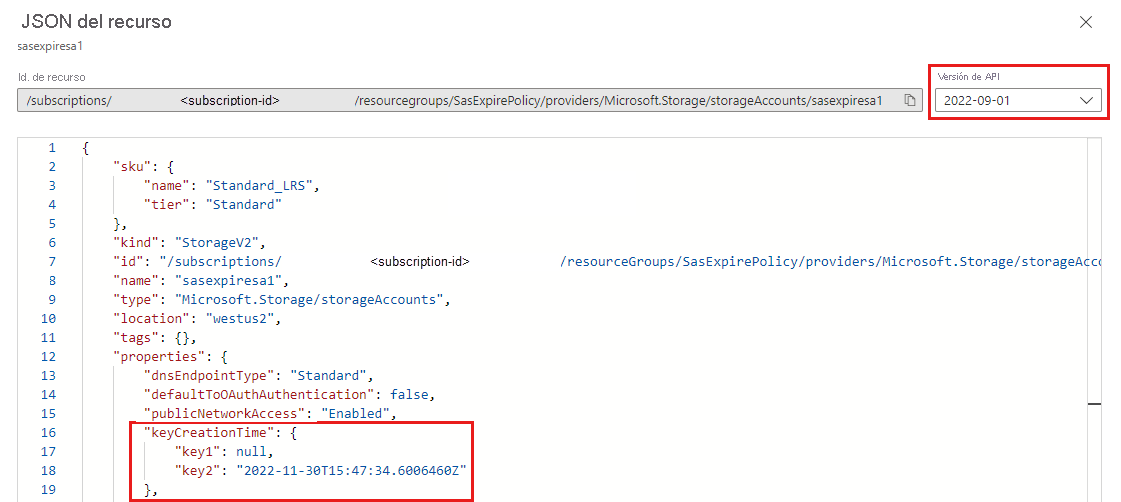 También puede obtener el valor keyCreationTime de una cuenta de almacenamiento si llama a la operación Storage Accounts - Get Properties en la API REST.