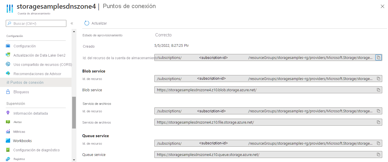 Si la cuenta de almacenamiento está replicada geográficamente, los puntos de conexión secundarios también aparecerán en esta página.