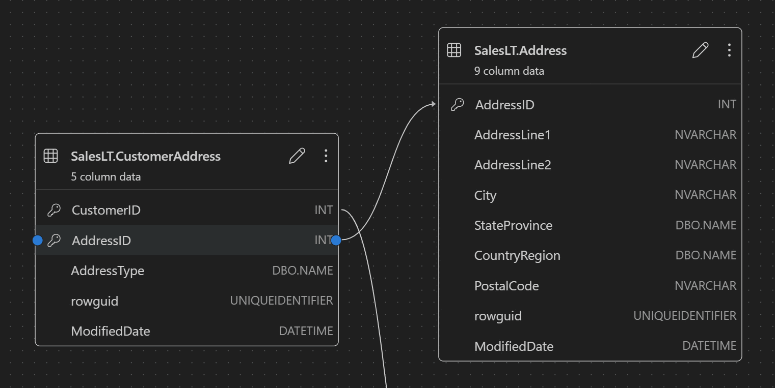 Las relaciones de clave externa se muestran con flechas de conexión entre columnas. Por ejemplo, en el diagrama anterior, la AddressID columna de la CustomerAddress tabla hace referencia a la AddressID columna de la Address tabla, que representa visualmente la relación entre ellos.