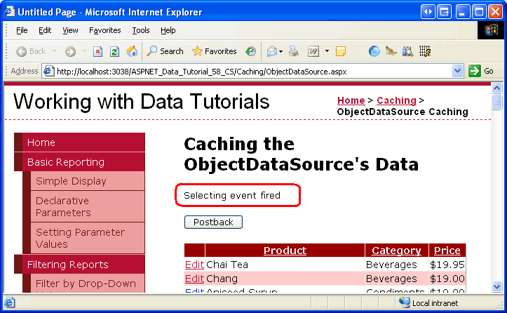 Guarde los cambios y vuelva a visitar esta página en un explorador. El texto activado del evento Selecting aparecerá cuando visite por primera vez la página, ya que inicialmente los datos no están en la memoria caché. Pero los postbacks posteriores desencadenados al hacer clic en el botón Postback, ordenar, paginar o hacer clic en los botones Editar o Cancelar no vuelven a mostrar el texto generado por el evento Selecting. Esto se debe a que el Selecting evento solo se desencadena cuando ObjectDataSource obtiene sus datos de su objeto subyacente; el Selecting evento no se desencadena si los datos se extraen de la caché de datos.