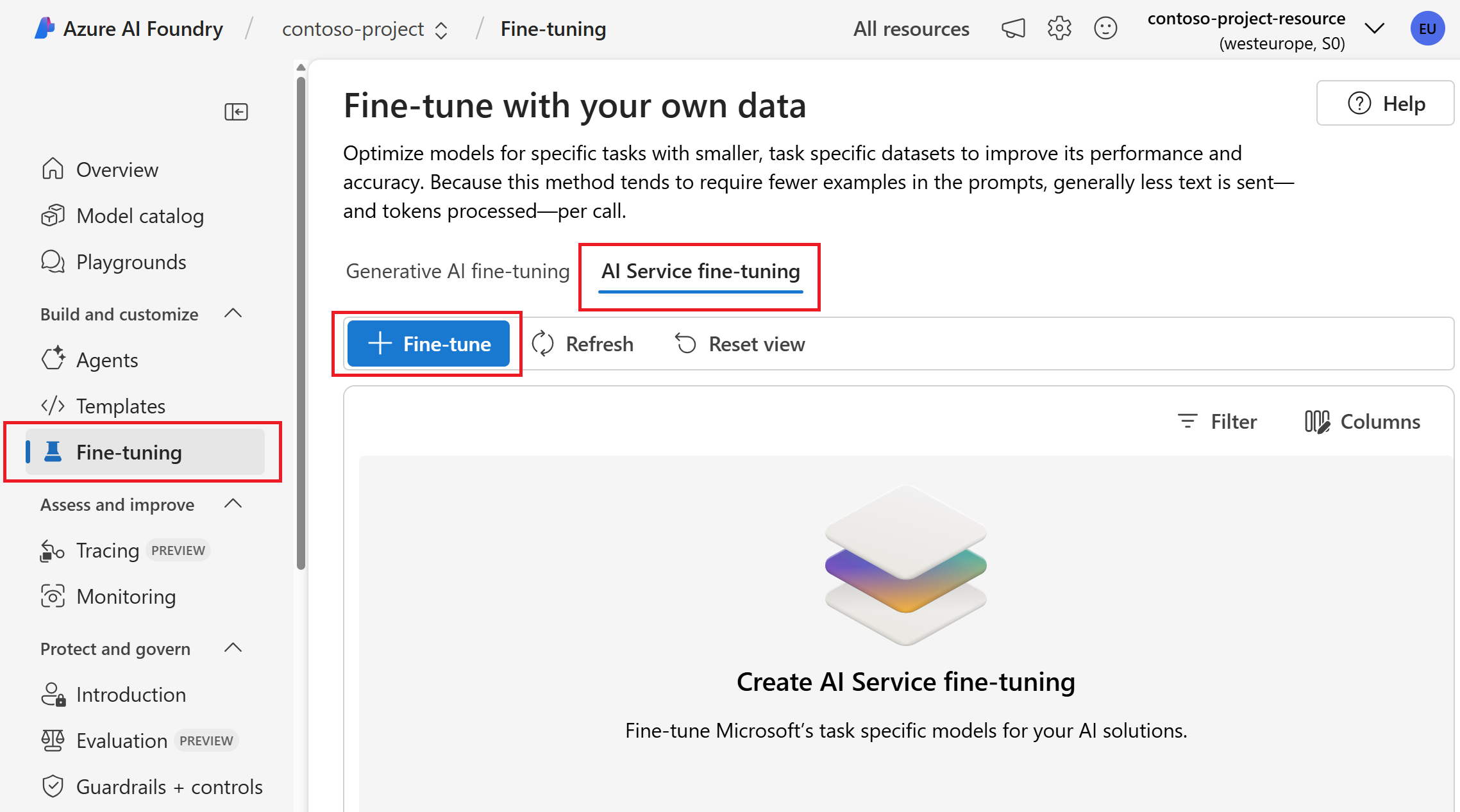 Seleccione Ajuste preciso del servicio de IA>+ Ajuste preciso.