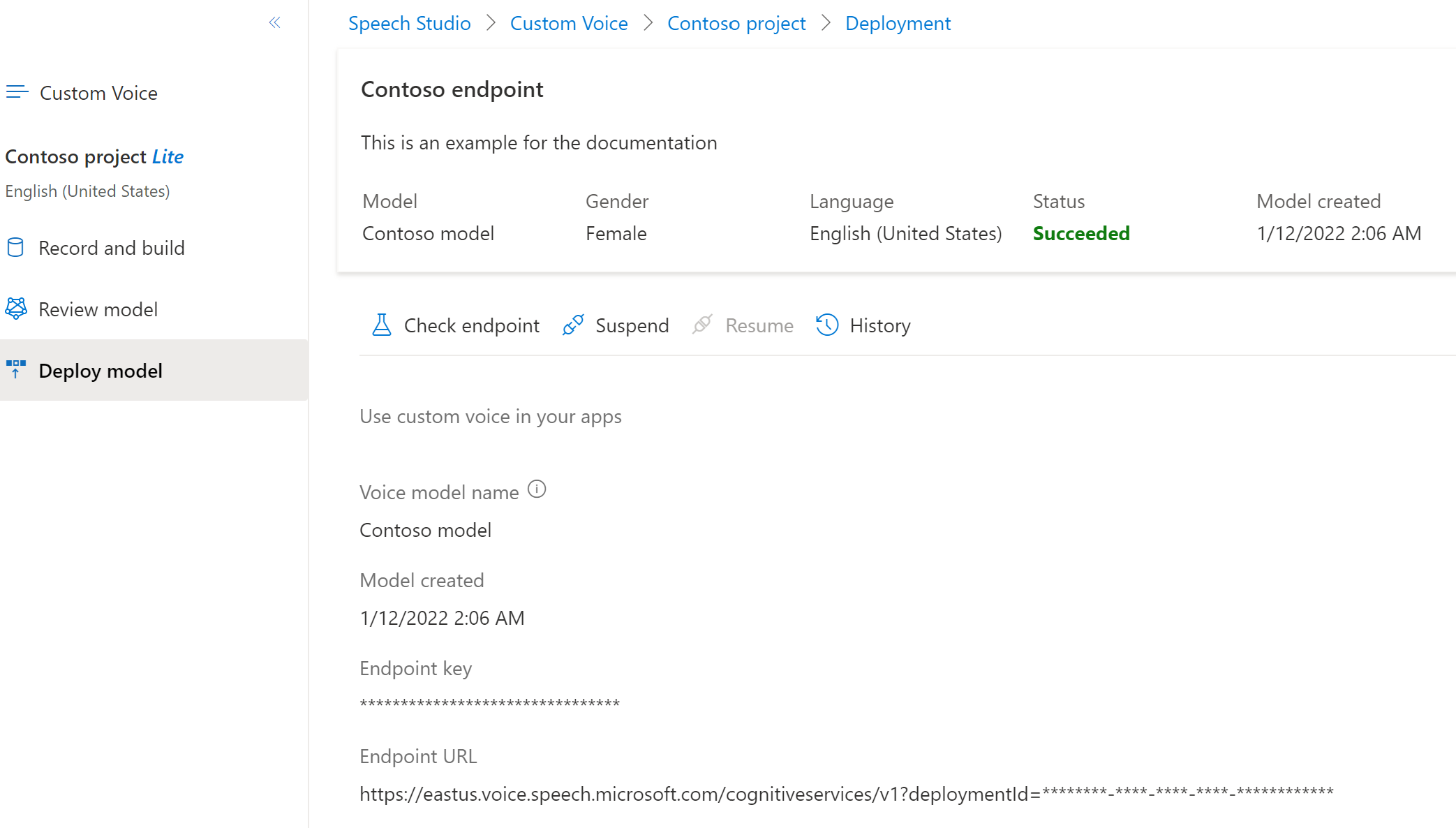 - La Clave de punto de conexión muestra la clave del recurso de Voz a la que está asociado el punto de conexión. Use la clave de punto de conexión como valor del encabezado de solicitud