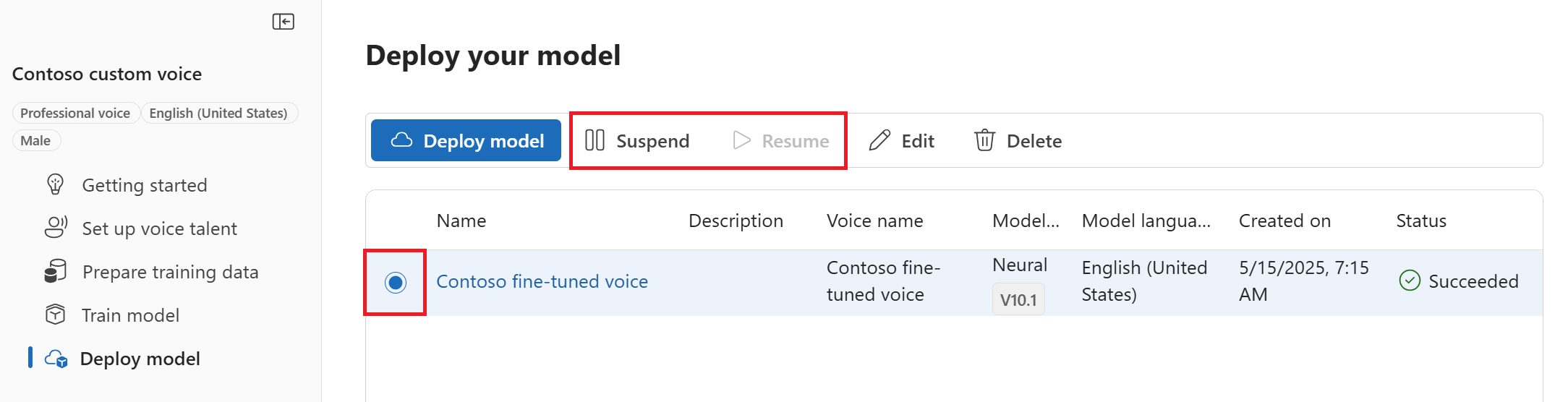 Después de crear y entrenar correctamente el modelo de voz, lo implementará en un punto de conexión de voz personalizado.