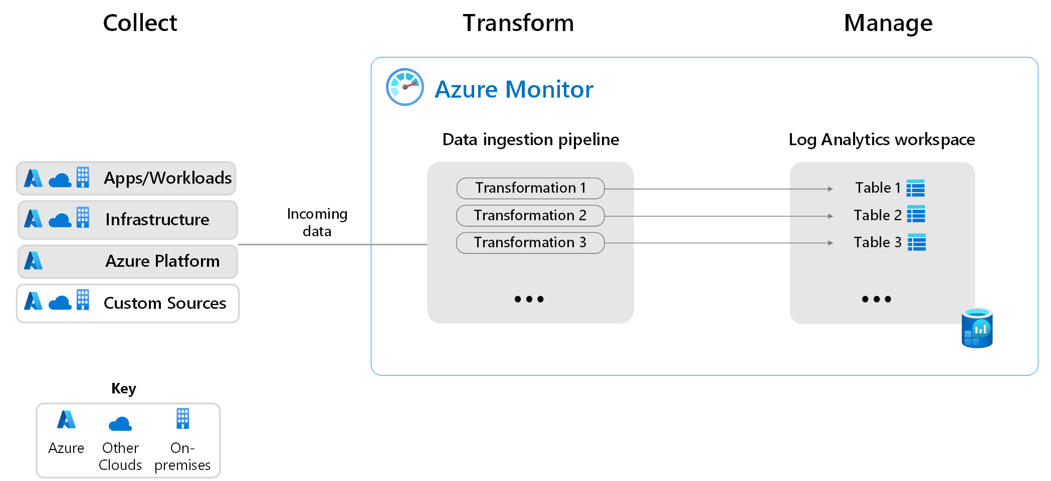 Las capacidades de recopilación de datos de Azure Monitor le permiten recopilar datos de todas sus aplicaciones y recursos que se ejecutan en Azure, otras nubes y en las instalaciones. Una potente canalización de ingesta habilita el filtrado, la transformación y el enrutamiento de los datos a las tablas de destino en su área de trabajo de Log Analytics para optimizar los costos, las capacidades de análisis y el rendimiento de las consultas.