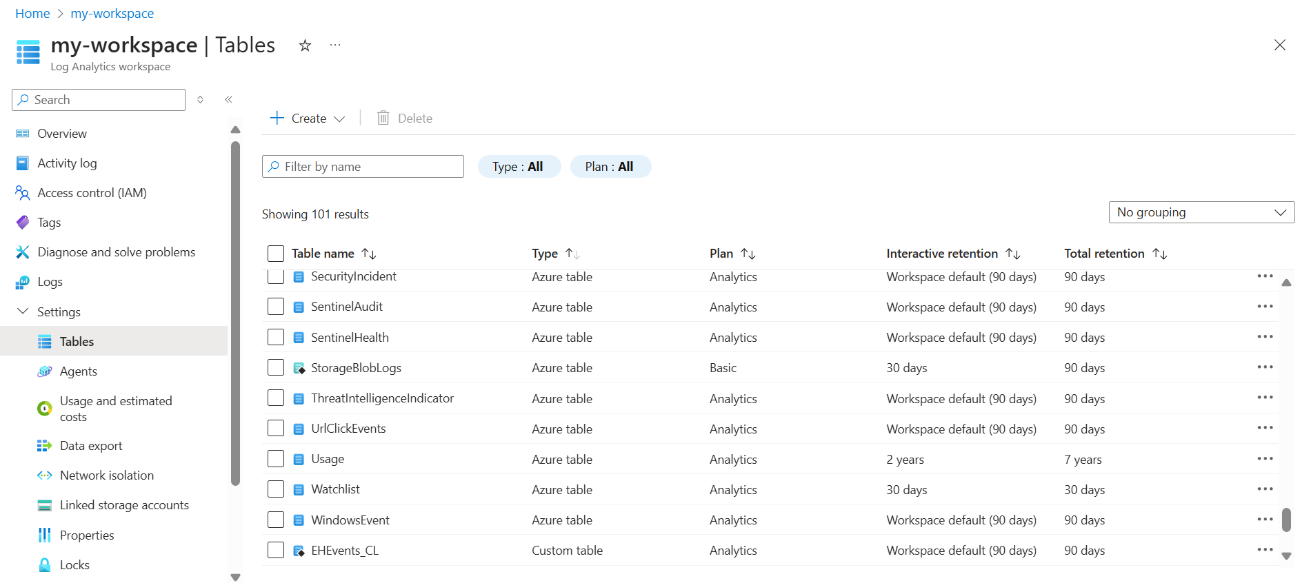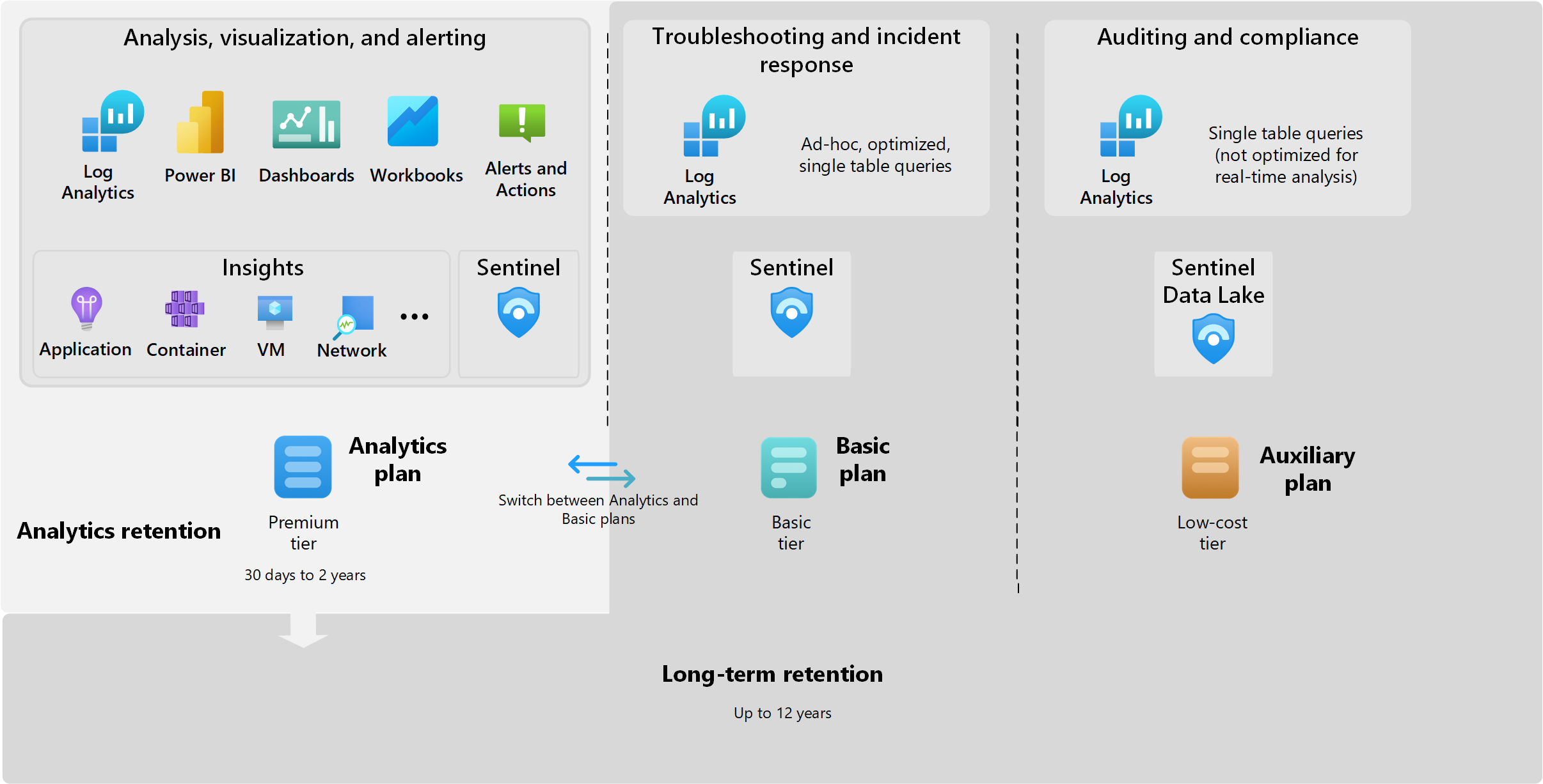 | Conservar datos para la auditoría y el cumplimiento | Envíe datos directamente a una tabla con el plan auxiliar y extienda la retención de datos en cualquier tabla para mantener los datos de auditoría y cumplimiento hasta 12 años. El plan de tabla auxiliar de bajo costo y la retención a largo plazo en el espacio de trabajo le permiten reducir los costos y usar sus datos de forma rápida y sencilla cuando los necesite. |