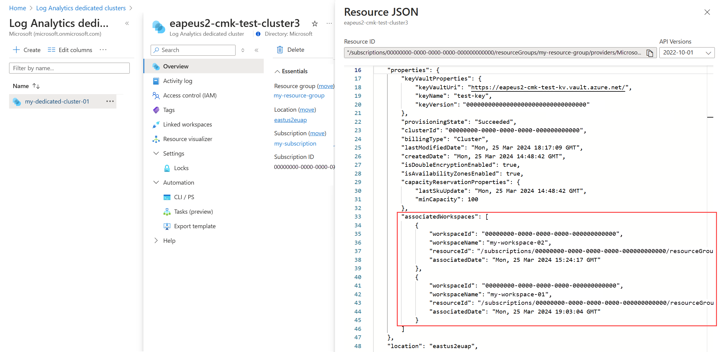 En la página Información general del clúster dedicado, seleccione Vista JSON. En la sección se enumeran las áreas de trabajo vinculadas al clúster.
