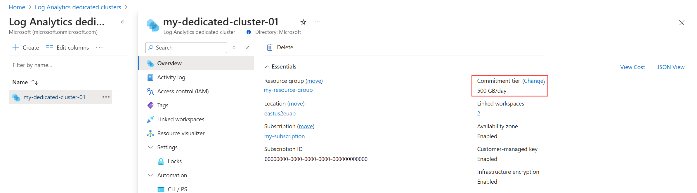 Seleccione el clúster en el menú Log Analytics dedicated clusters del Azure Portal. Seleccione Cambiar junto a Nivel de compromiso.