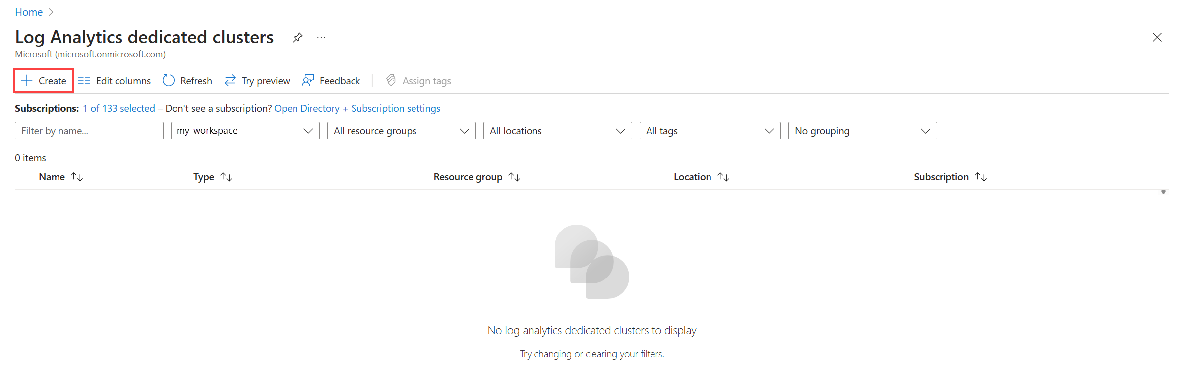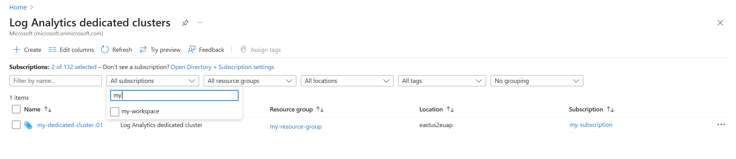 En el menú clústeres dedicados de Log Analytics en el portal de Azure, seleccione el filtro Subscription.