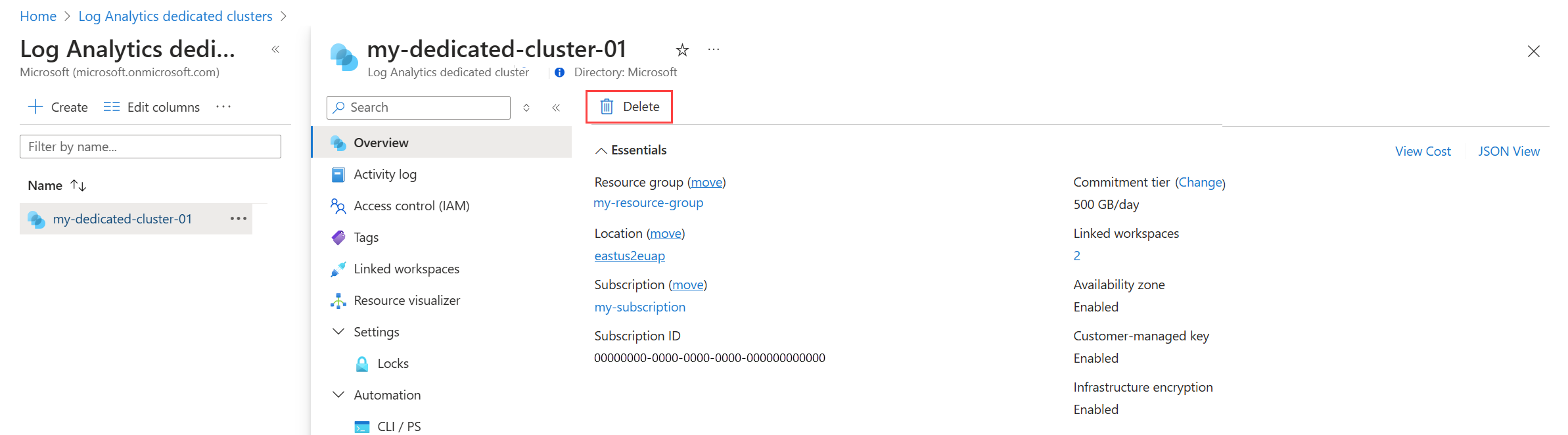 Seleccione el clúster en el menú Log Analytics dedicated clusters del Azure Portal. A continuación, seleccione Eliminar.