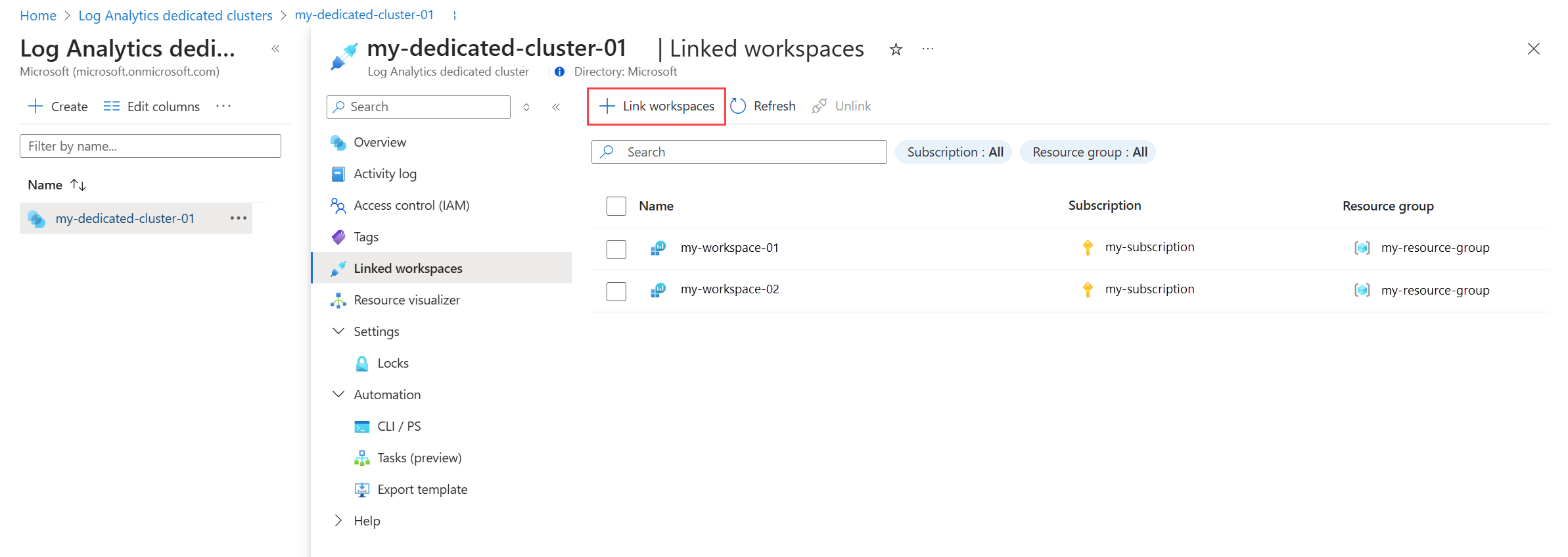 Use los pasos siguientes para vincular un área de trabajo a un clúster. Puede usar la automatización para vincular varias áreas de trabajo: