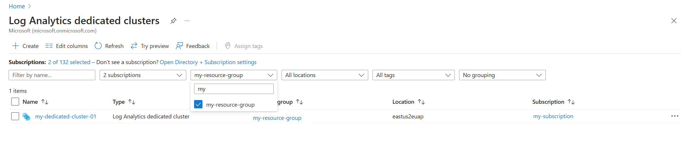 En el menú clústeres dedicados de Log Analytics del portal de Azure, seleccione el filtro grupo de recursos.