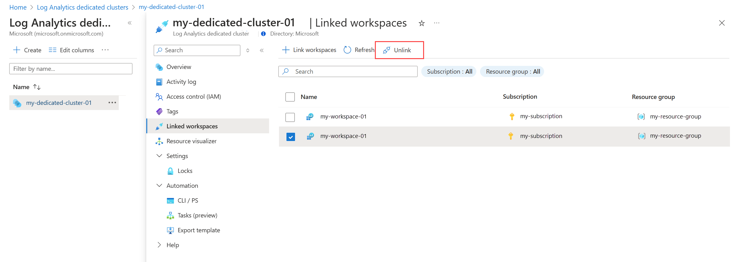 Seleccione su clúster en el menú Clústeres dedicados de Log Analytics en Azure Portal. Seleccione Áreas de trabajo vinculadas para ver todas las áreas de trabajo vinculadas actualmente al clúster dedicado. Seleccione las áreas de trabajo que quiera desvincular y seleccione Desvincular.
