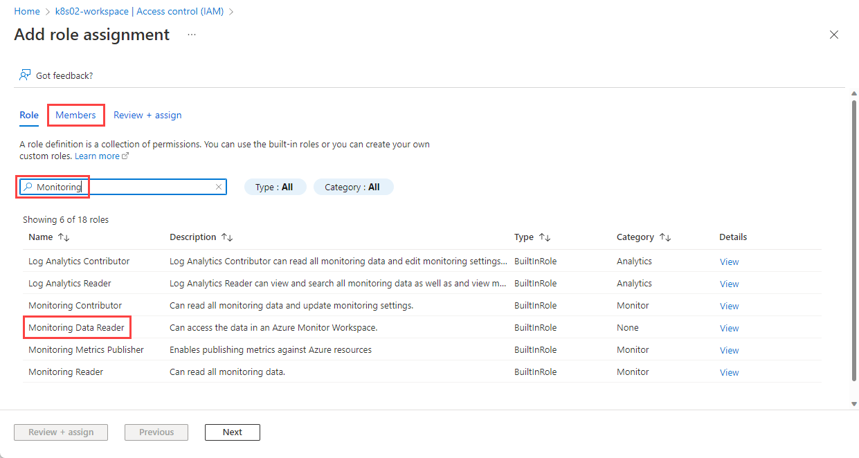 Si el rol Lector de datos de supervisión no aparece en la lista para su suscripción o grupo de recursos, seleccione + Agregar asignación de roles.