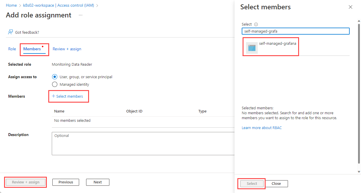 Elija Seleccionar miembros. Busque la aplicación que registró en la sección Registro de una aplicación con Microsoft Entra ID y selecciónela.