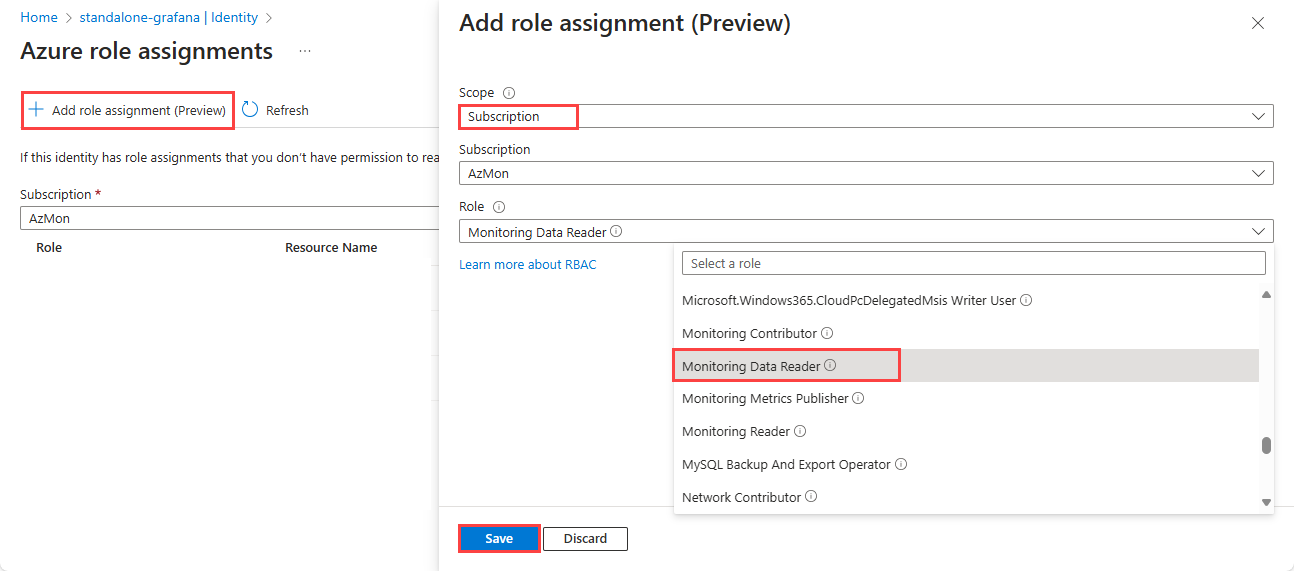 En la lista desplegable Rol , seleccione Monitoring Data Reader (Lector de datos de supervisión ) y, a continuación, seleccione Save (Guardar).