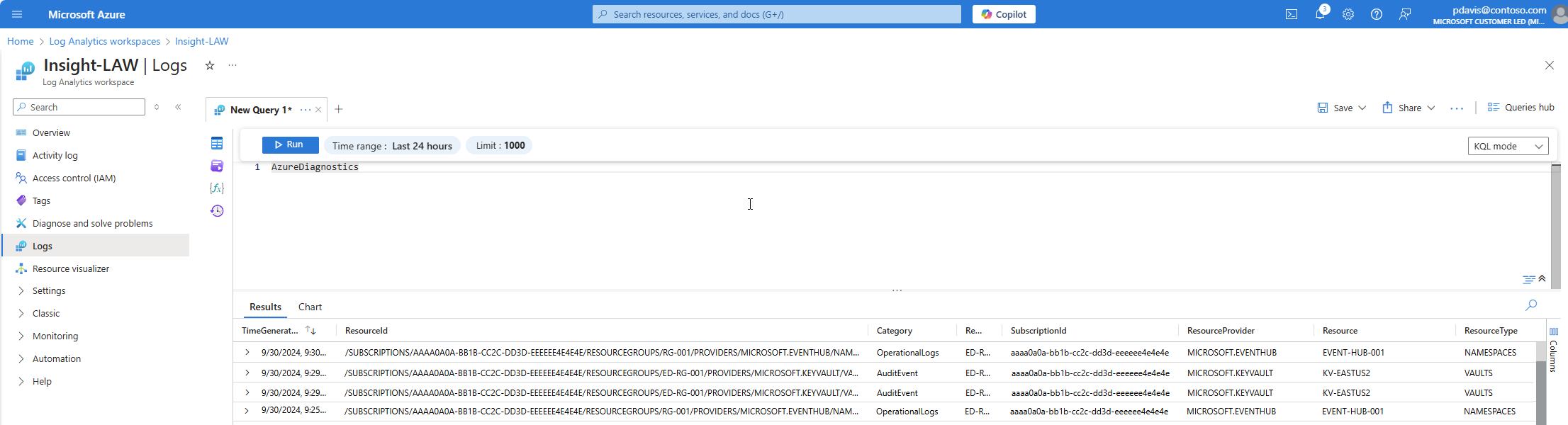 La tabla AzureDiagnostics contiene el resourceId del recurso que generó el registro, la categoría del registro y la hora en que se generó el registro, así como las propiedades específicas del recurso.