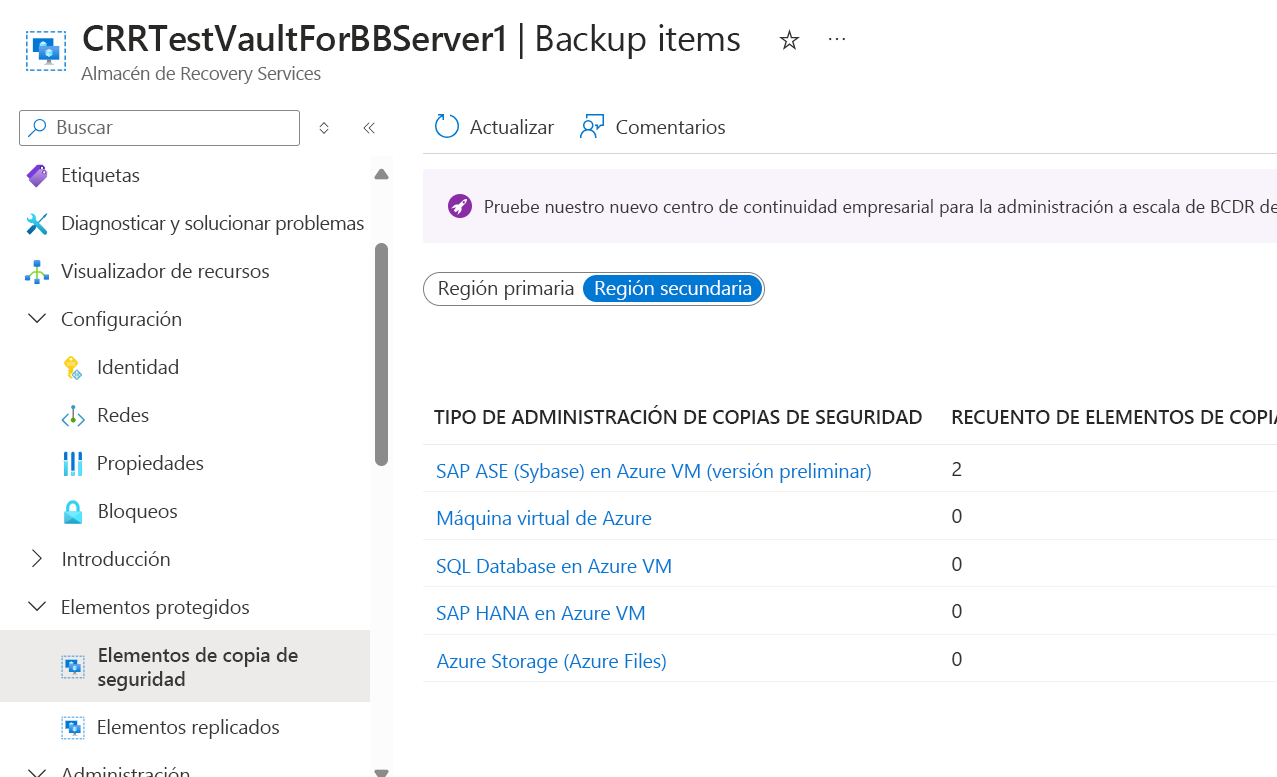 En el almacén de Recovery Services, puede habilitar la restauración entre regiones que le permite restaurar la base de datos en una región secundaria. Más información sobre cómo activar la restauración entre regiones.