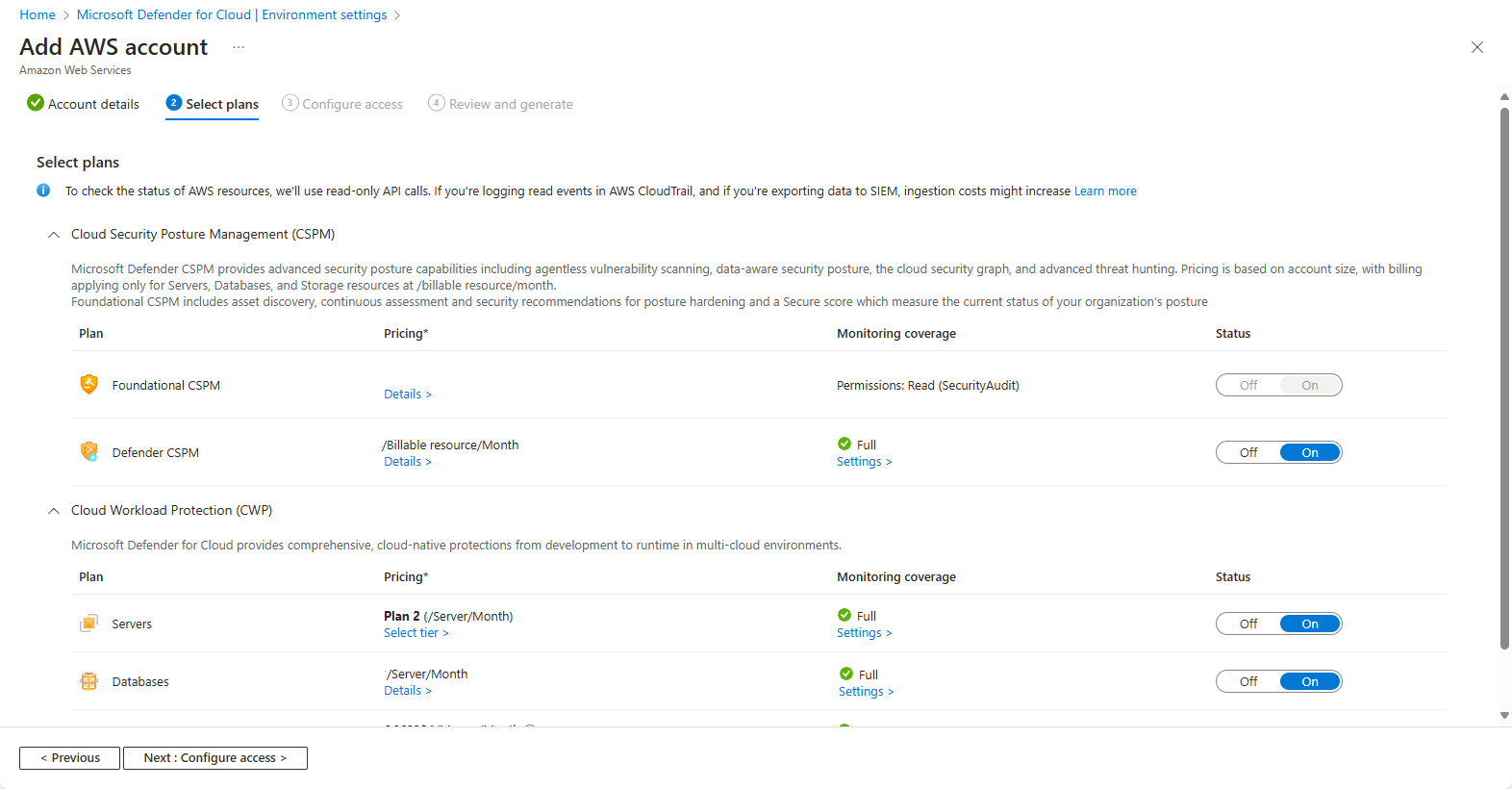 Revise las selecciones de plan predeterminadas, ya que es posible que algunos planes se habiliten automáticamente en función de la configuración. Por ejemplo, el plan de bases de datos amplía la cobertura de Defender para SQL a AWS EC2, RDS Custom para SQL Server y bases de datos relacionales de código abierto en RDS.