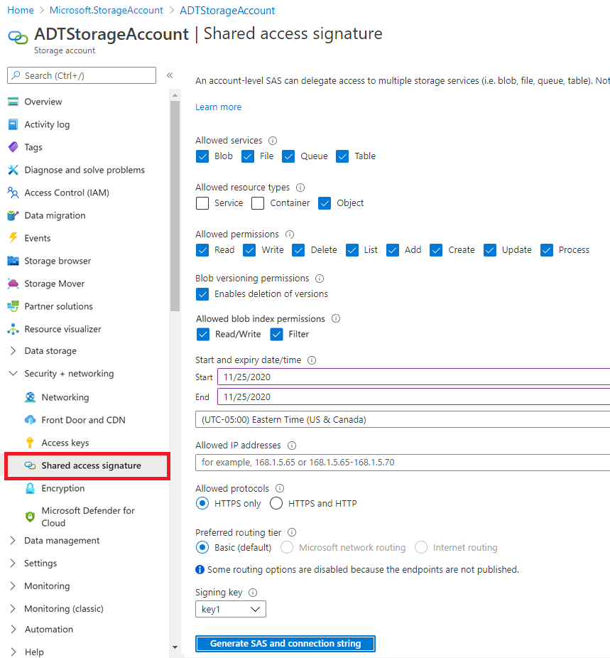 Cuando haya terminado, seleccione Generar SAS y cadena de conexión para generar el token de SAS.