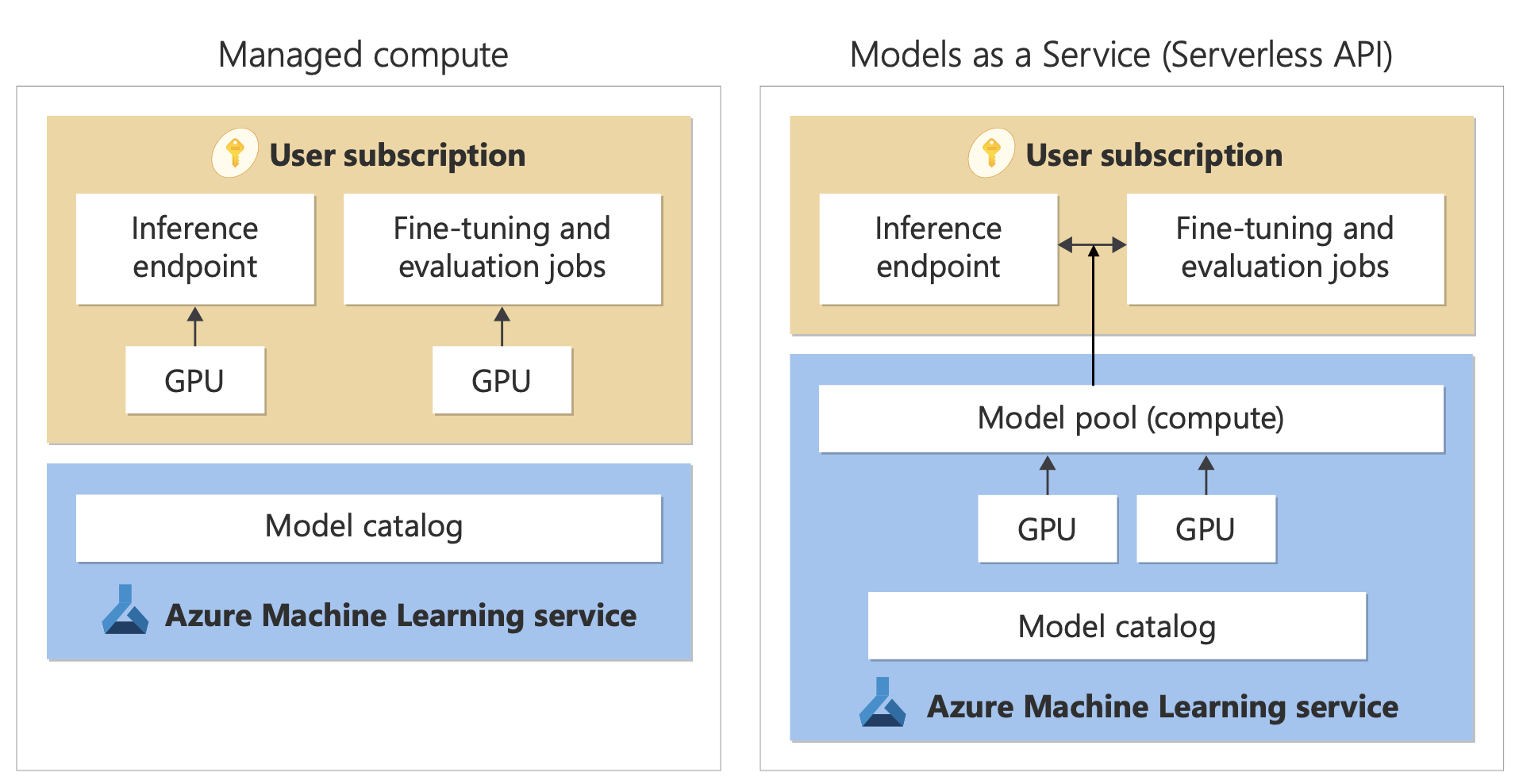 Las implementaciones sin servidor proporcionan una manera de consumir modelos de Foundry como API sin hospedarlos en la suscripción. Los modelos se hospedan en una infraestructura administrada por Microsoft, que permite acceso basado en API al modelo del proveedor. El acceso basado en API puede reducir drásticamente el costo de utilizar un modelo y simplificar la experiencia de configuración.