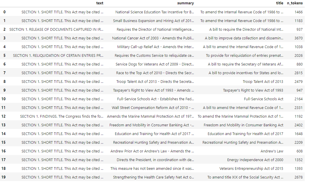 BillSum es un conjunto de datos de proyectos de ley del Congreso de los Estados Unidos y del estado de California. Con fines ilustrativos, solo veremos las facturas estadounidenses. El corpus consta de facturas de las sesiones 103 a 115 (1993-2018) del Congreso. Los datos se dividieron en 18 949 facturas de entrenamiento y 3269 facturas de prueba. El corpus de BillSum se centra en la legislación de longitud media de 5000 a 20 000 caracteres. Puede encontrar más información sobre el project y el documento académico original del que se deriva este conjunto de datos en el repositorio BillSum project GitHub