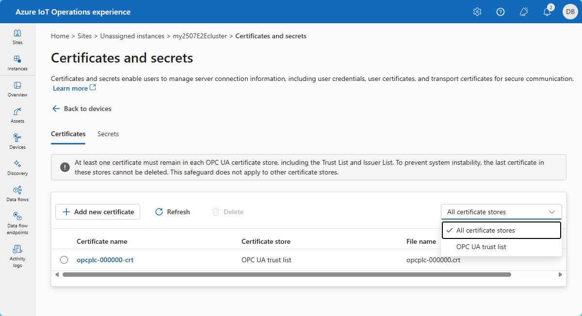- Seleccione el almacén de certificados adecuado para el conector que usa el certificado. Por ejemplo, lista de confianza de OPC UA.