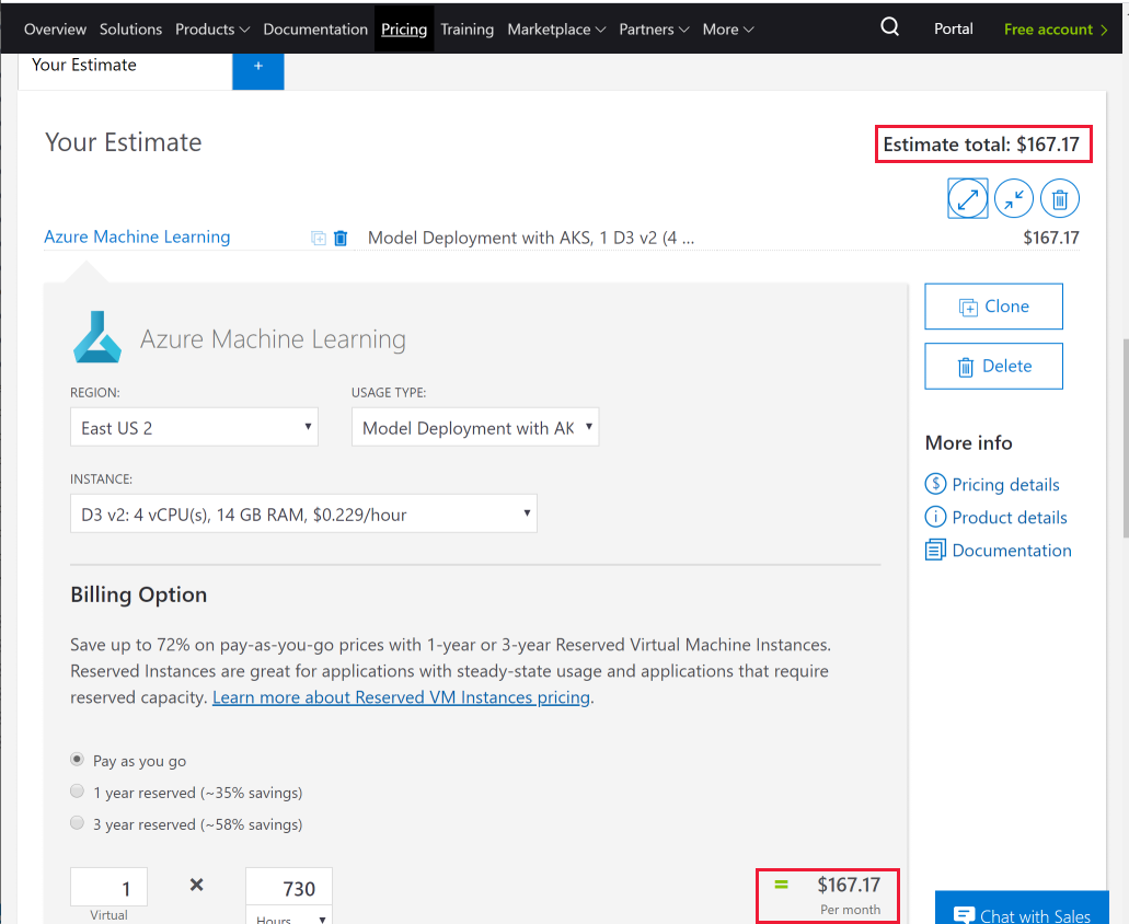 En la captura de pantalla siguiente se muestra una estimación de los costos de ejemplo en la calculadora de precios: