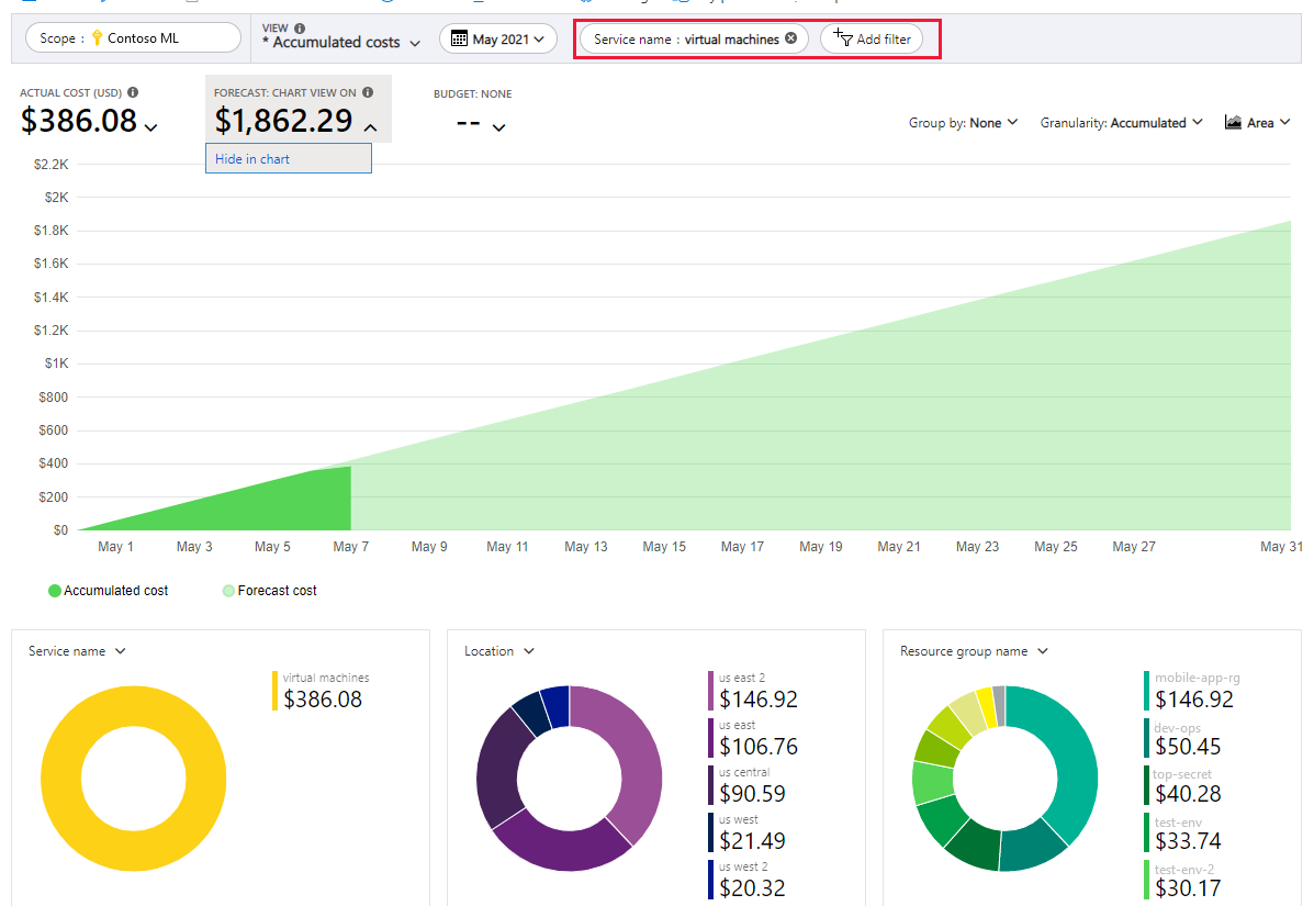 Para limitar la información a los costos de un único servicio, como Azure Machine Learning, seleccione Agregar filtro y, luego, elija Nombre del servicio. A continuación, seleccione máquinas virtuales.