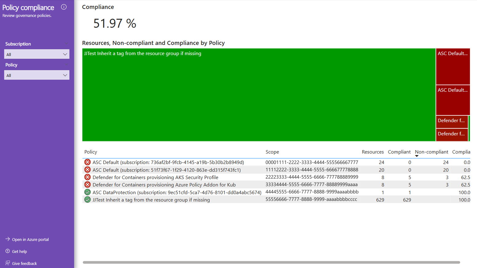 En la página Cumplimiento de directivas se enumeran las directivas configuradas en Azure Policy para las suscripciones seleccionadas.